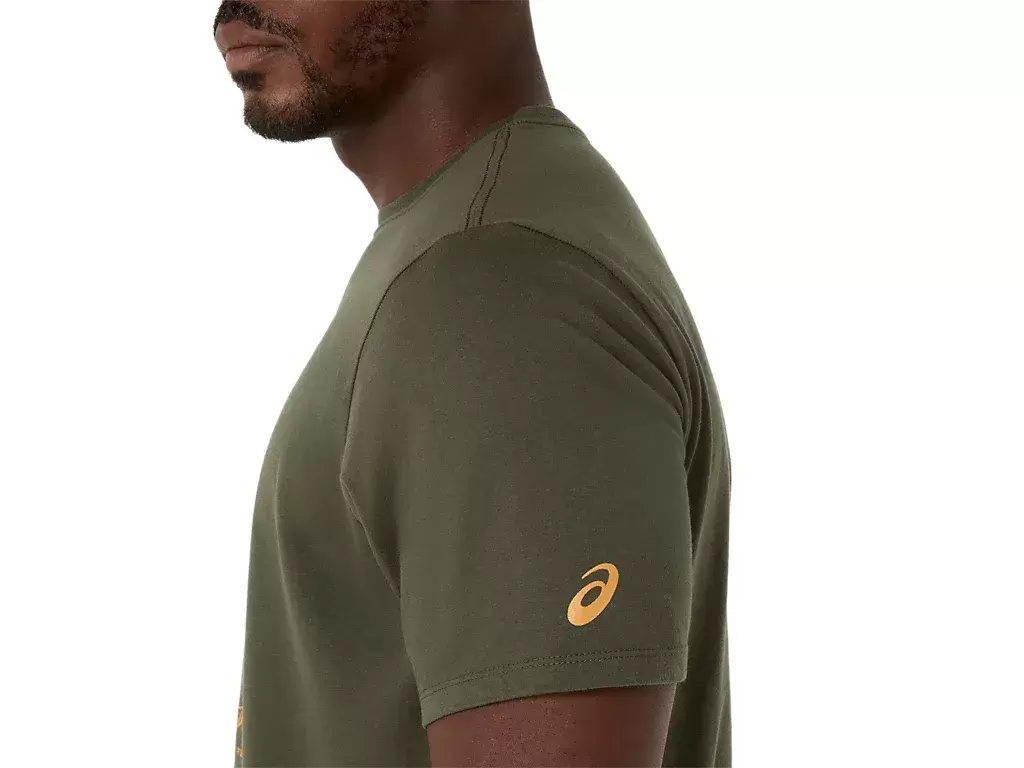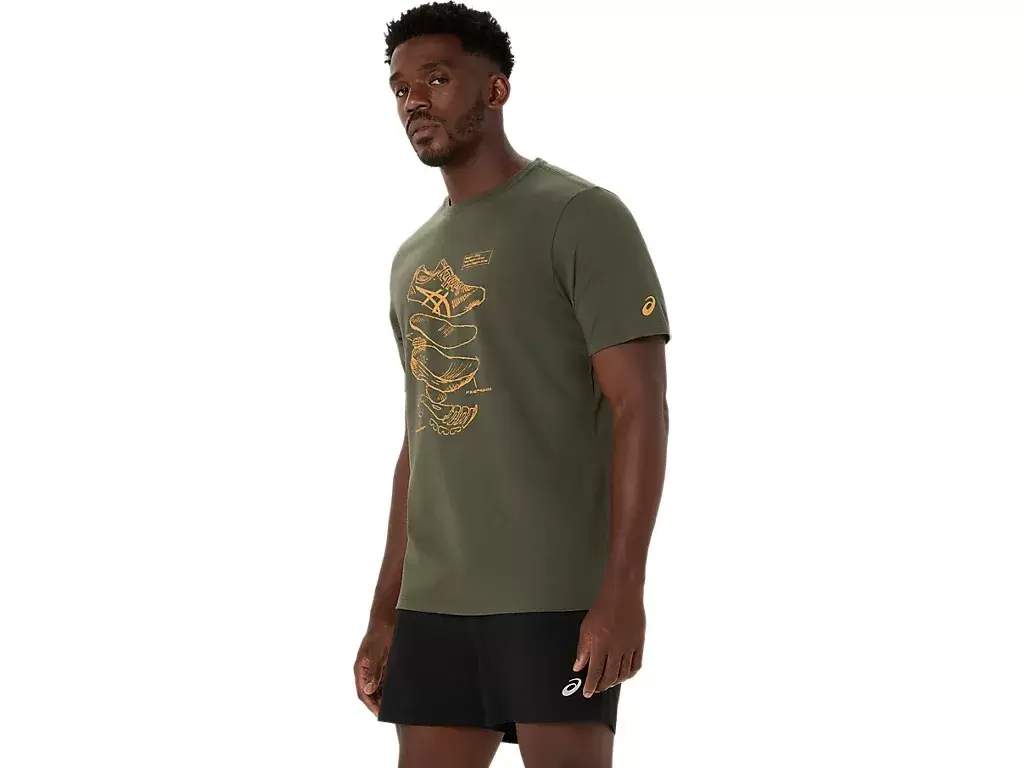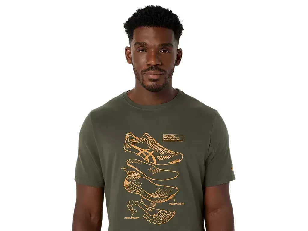 This comfortable knit short sleeve tee takes inspiration from performance ASICS running shoe sketches. It’s stamped with a front graphic that features the various components used to build our running shoes.
