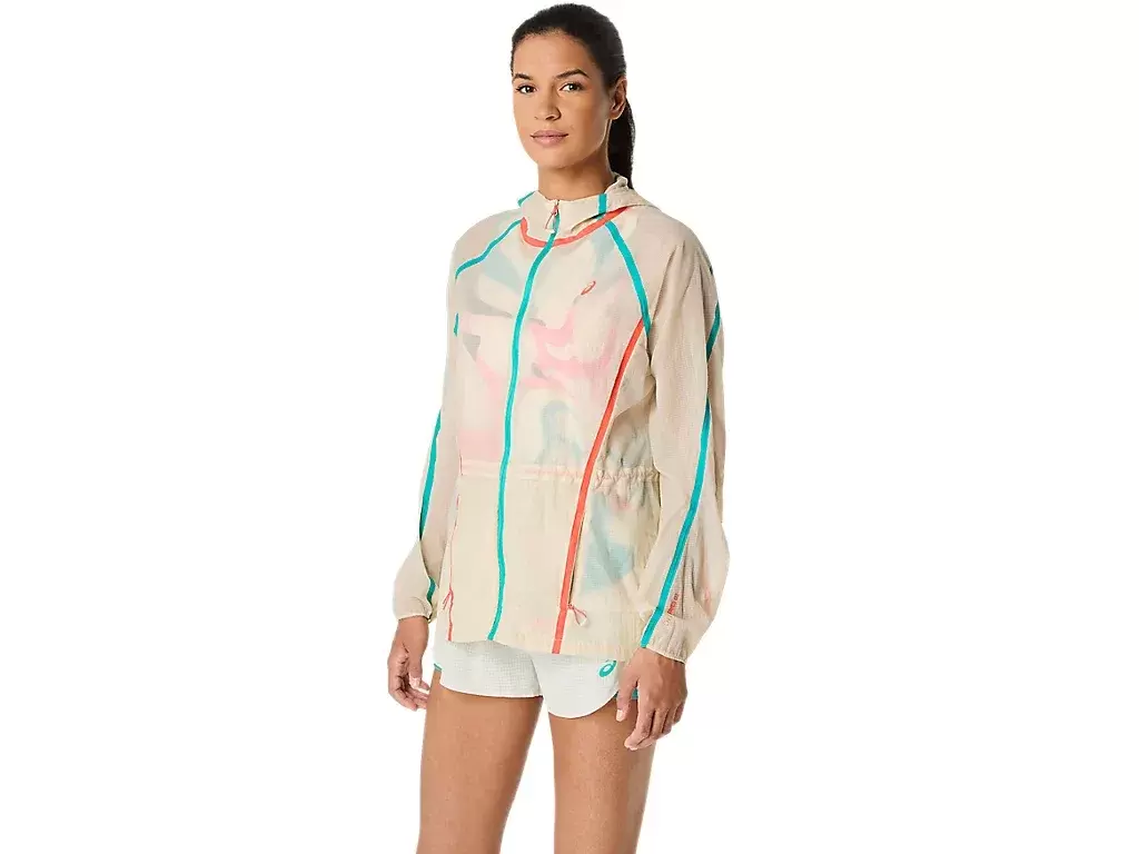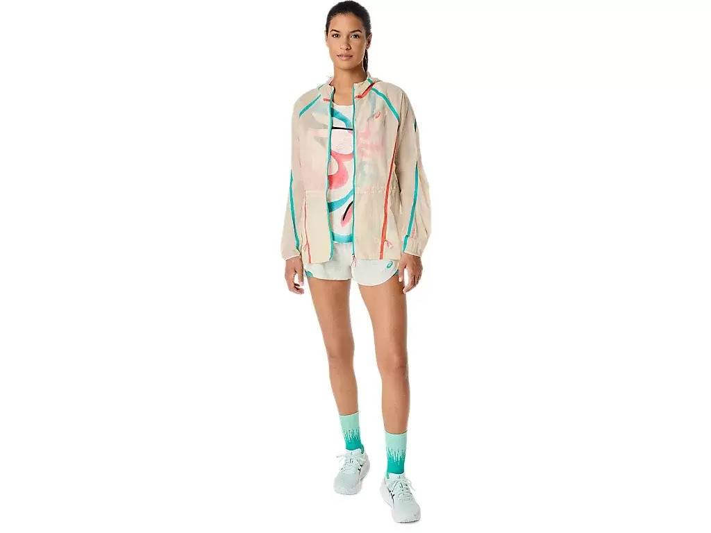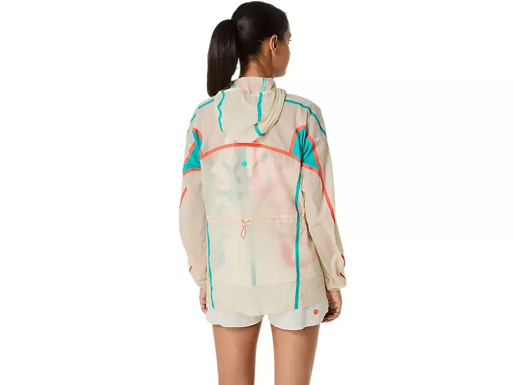 The ROAD PACKABLE JACKET is a lightweight and see-through windbreaker made from a woven fabric with a water-repellent finish to help shield light rain. It has an adjustable hood and can be easily packed into the side pocket when not needed.