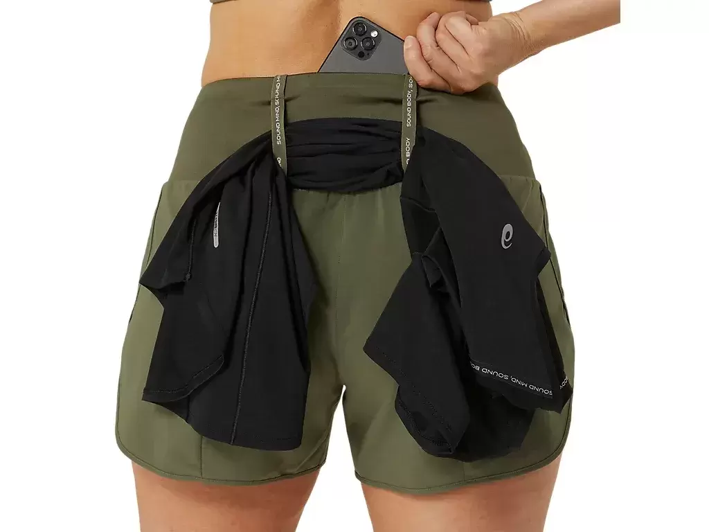 This short features multiple pockets, including: a center back pocket for phone storage and two front smaller pockets. Additionally, there is an elasticated loop system to stash a jacket, tee, towel, or any running essential.