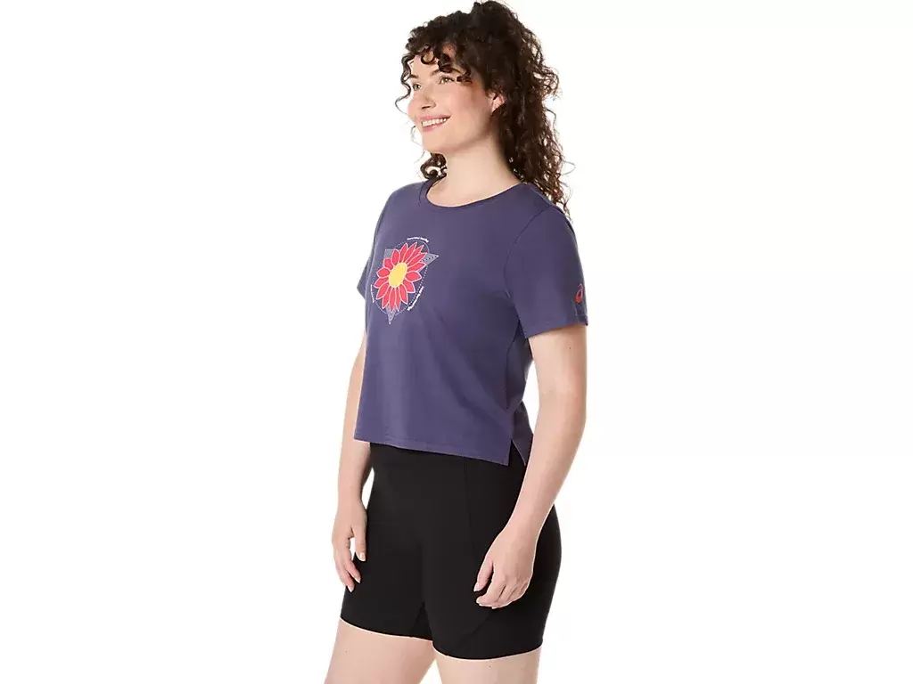 This comfortable knit short sleeve tee features a crop top design that’s accented with a sunflower graphic on the chest